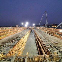 The APM’s 2.25 mile elevated guideway will be constructed using cast-in-place methods, span by span for 93 spans. The average length of each span is 85 feet and an estimated 72,000 cubic yards of concrete will be used to build an entire guideway segment, which includes the foundation piles, columns, guideway deck and concrete tracks. Construction of the guideway deck for the entire APM system will require approximately 304 major concrete placements.