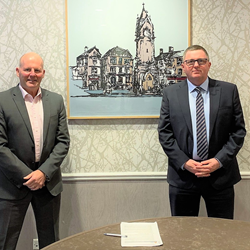 Steve Hunt (L), Stork’s Regional Director for the UK finalizes the agreement with Dave Tomlinson (R), Sellafield’s Head of Inspection Services, Inspection and Certification Group. (Photo: Business Wire)